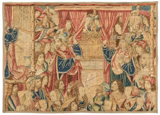 Frankreich, 16. Jh. Biblische Szene, in der das Aaronsstab-Wunder dargestellt wird. Alte Reparaturen, Gebrauchsspuren. 182x244 cm (ft. 6x8.1).