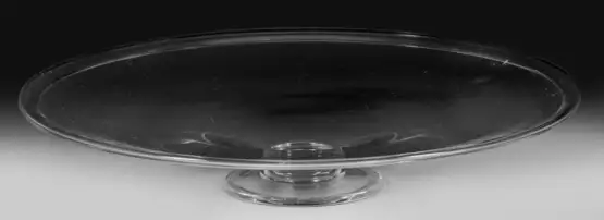 Farbloses Glas. Auf niedrigem Fuß schwach gemuldete Schale mit umgeschlagenem Rand. H. 5,4 cm, D. 30 cm.