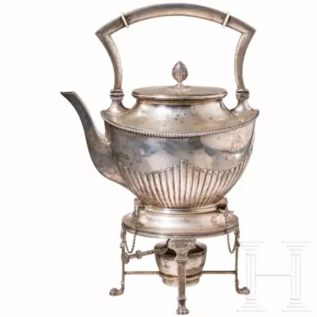 Silber. Der untere Teil der ovalen Wandung partiell godronniert, oberer Rand mit Perlbandzier. Der Scharnierdeckel mit plastischem Pinienknauf. Kantiger, beweglicher Henkel. Auf Stövchen mit vier Tatzenfüßen. Unterseite der Kanne und Rechaud punziert mit Mondsichel, Krone, Feingehalt "800" sowie "Gebr. Friedländer". Höhe 38 cm (mit Henkel), Gesamtgewicht 1800 g.