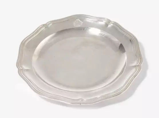 Silber. Meistermarke François Corbie. Rundform mit fassoniertem und profiliertem Rand. Auf Fahne graviertes Wappen. D 28 cm, ca. 650 g.