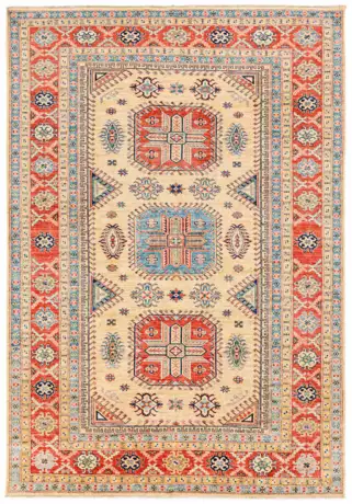 Pakistan. Wolle auf Baumwolle. Im cremefarbenen Innenfeld drei große hakenbesetzte Rautenmotive in Rot und Hellblau. Umlaufend breite, hellrote Rosettenbordüre, flankiert von schmalen Bändern. 195 cm x 282 cm.