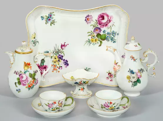6-tlg.; Zwei Kannen, zwei Tassen mit Untertassen, kleine Zierschale, Tablett. Birnförmiger Korpus mit Maskaron-Schnabelausguss und Rocaillehenkel. Gewölbter Deckel mit plastischem Pinienknauf. Kugelig gedrückte Körper mit Asthenkeln neben reliefplastischen Blüten. Überwiegend Reliefdekor "Alt- und Neuozier". Auf der Wandung und im Spiegel Blumengebinde mit gestreuten Blüten. Polychrome Malerei mit Goldstaffage. Eine Kanne und Deckel passend erg.; Partiell rest.; Teilw. kurzer Spannungsriss. Schwertermarke. Kannen-H. 15 cm -16,5 cm. Tablett 28,5 cm x 22 cm.
