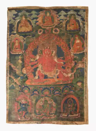 Tibet, 18./19.Jh. Farbe auf Leinwand. Mittig stehender Vajrapani, in seiner rechten Haupthand sein Symbol, das Vajra, haltend. Unter seinen Füssen die Nagas (Schlangen), Symbol von Wasser und Fruchtbarkeit. Ihn umgeben weitere Gottheiten wie die Grüne Tara sowie hohe Geistliche. 60,5x41,5 cm.