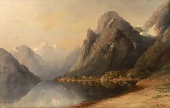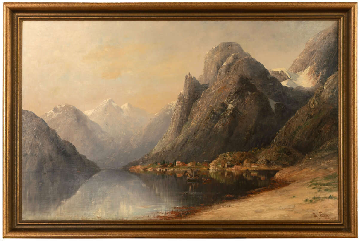 Fjord landscape, oil on canvas, 95 x 153 cm canvas dimensions, signed, dated 1899, located in Düsseldorf, craquelured with cracks and flaking