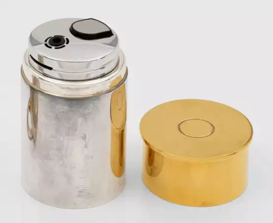 Plated, teilw. vergoldet. Zylindrischer Korpus mit flachem, vergoldeten Stülpdeckel. Im Inneren herausnehmbare Mechanik des Feuerzeuges. Gem. "HERMÈS PARIS/ Made in France". H. 10,5 cm. D. 6,5 cm.