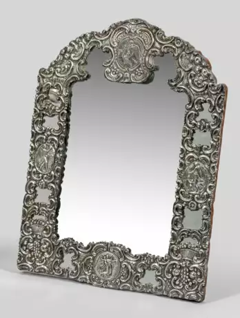 Silber über Holzkern. Rechteckig, oben mit Rundbogenabschluss. Breiter, geschweifter, durchbrochen gearbeiteter Rahmen mit Rocaillen, Blumenkörben und allegorischen Frauengestalten in Medaillons nach Bertel Thorvaldsen. Rückseitige Standvorrichtung. Gest. Pseudomarken. 50 x 38 cm.