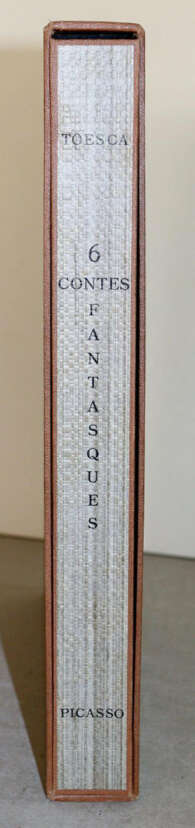 Goeppert/Cramer 66. Bloch 363-368 und Livres 64. Schmidt/Goeppert, Kat. Basel 66. Rauch 78. Das Buch als Bild 20. - Eines von 75 numerierten Exemplaren. - Erste Ausgabe und eine der ersten Veröffentlichungen des französischen Schriftstellers Maurice Toesca, Picassos Kupferstiche hierzu entstanden bereits 1944. "Der Verleger Henri Flammarion hatte schon im Februar 1943 den Plan, die sechs wunderlichen Erzählungen des 1904 geborenen Schriftstellers Maurice Toesca mit Illustrationen von Picasso zu veröffentlichen .. Am 30. April 1944 machte Picasso sechs Kupferstiche; abgesehen von einer Radierung (La Torera ) sind sie die einzigen Graphiken dieses Jahres .. Die erste Abbildung konfrontiert ein idealisiertes Frauenprofil mit einer abstrakt konstruierten Kunstfigur . Es folgen ein weiblicher Akt und ein Portrait von Dora Maar im Profil. Die abstrakte Figur der vierten Abbildung ist eine graphische Transposition des Ölbildes vom 27. April 1944, die zugleich an Skulpturen von 1931 und die "Buste de femme" von 1943 erinnert. Die fünfte Abbildung zeigt ein Gesicht in der Art einer afrikanischen Dan-Maske. Die letzte Abbildung zeigt einen Frauenkopf mit einer Blumengirlande im Haar" (Goeppert, Kat. Basel). Neben dieser Ausgabe auf Vélin Montaval erschien noch eine Suitenausgabe und weitere 100 Exemplare auf Vergé d'arches. - 1 of 75 numbered copies on Vélin Montaval. With 6 orig. engravings by P. Picasso and 6 woodcut initials by P. Bouchet. Orig. wrappers with half cloth chemise in slipcase. - Inner side of the wrappers slightly glue stained. - Fine copy.