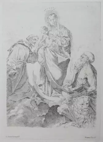 (1621/21 Bologna - Modena 1661). Maria mit Jesuskind und Hl. Franziskus sowie Hl. Hieronymus. Radierung nach Ludovico Caracci. B17. Jhdt. 41,5 x 30 cm.