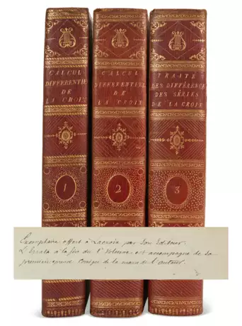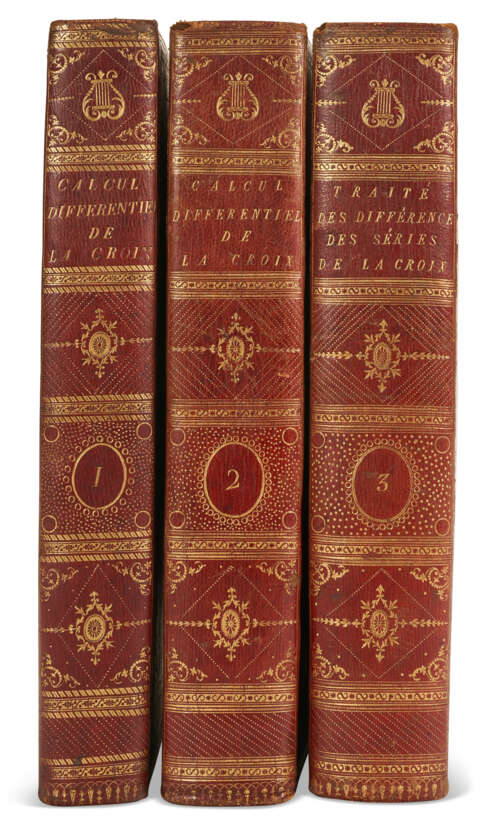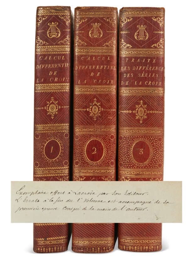 Three volumes, quarto (290 x 209mm). Half-titles in volume II & III, the latter bound at the end, 9 folding plates and tables, 4pp. proof errata at the end of vol. I with ink corrections, pp.97-100 of vol. II reproduced at the end of the volume incorporating corrections to errata (minor spotting). Full red morocco by Champy, sides with double fillet gilt borders enclosing gilt floral roll and inner double fillet panel, spine decoratively gilt, silk endleaves, all edges gilt (endleaves and extremities slightly rubbed). Provenance: an early inscription at the front of volume one identifies this as a presentation from Lacroix's editor to the author – the author (manuscript emendations).