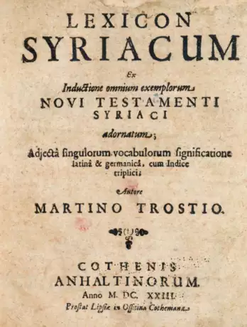 ADB 38, 657. VD17 12:128565E. - Trost (1588-1636) machte sich in seiner Zeit besonders um die syrische Sprache und Literatur verdient. - Anfang angerändert (tls. etw. Textverlust), durchgehend etw. gebräunt, vereinzelt etw. fleckig, vord. flieg. mit Ausschnitt u. hs. Eintragung. Ehemaliges Bibliotheksexemplar.
