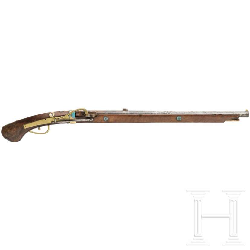 Oktagonaler Lauf im Kaliber 12 mm, Seele rau, auf der Oberseite im hinteren Drittel mit Kupfer beschichtet und mit zwei japanischen Schriftzeichen graviert, im vorderen Teil mit Drache graviert, auf der Oberseite mit Sakimeate und Motomeate sowie rechts Pulverpfanne mit Kupfereinlage, Messingabdeckung und Feuerschirm aus Eisen. Glattes Luntenschloss aus Messing, Spannrast defekt. Lackierter Kashiholzschaft mit Messiggarnitur und floral verzierten Beschlägen, rechts am Kolben und auf der Schlossgegenseite mit Schnitzereien. Nicht zugehöriger hölzerner Ladestock. Beschläge teils korrodiert, Beschläge linksseitig am Kolben fehlen. Länge 90 cm.
