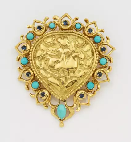 Gelbgold, gest. 18 ct.; Im Spiegel erhabene szenische Darstellung aus den Geschichten der Scheherazade "Tausend und eine Nacht", entouriert von persischen Türkis-Cabochons und Saphiren. Herstellerzeichen. Ref.-Nr. 16V187-1. Gew. ca. 38,85 g.