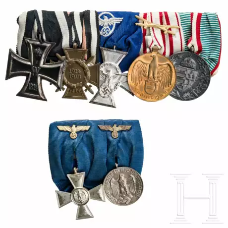 Fünfteilige Ordensschnalle mit Eisernem Kreuz 2. Klasse 1914, Frontkämpfer Ehrenkreuz, Polizei Dienstauszeichnung für 18 Jahre, Österreich Kriegserinnerungsmedaille 1914-1918 und Österreich-Ungarn Kriegserinnerungsmedaille 1914-1918 "Pro Deo Et Patria". zweiteilige Ordensschnalle mit Wehrmacht Dienstauszeichnung für 18 und 4 Jahre.