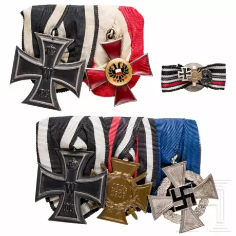 Ordensschnalle mit Eisernem Kreuz 2. Klasse 1914, Frontkämpfer-Ehrenkreuz und Treudienst-Ehrenzeichen für 25 Jahre mit Knopflochdekoration. Ordensschnalle mit Eisernem Kreuz 2. Klasse 1914 und Hanseatenkreuz Lübeck.