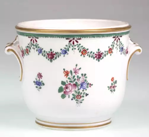 Лот 426 | Übertopf, Potschappel, mit Blumenmalerei, signiert, Gebrauchspuren, H. 12 cm, Innen-Dm. 12,5 cm