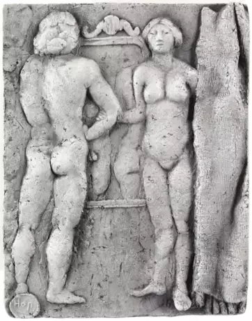 ╔Dabei:Unbek. Künstler╗, Männl. u. weibl. Akt vor einem Spiegel. Gipsrelief. 22,5 x 16,,8 cm.