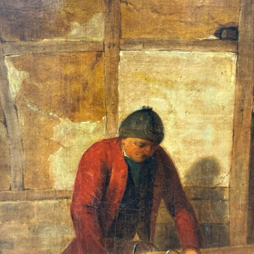 Flax breaker/flax cutter in front of his barn, oil on canvas, 132 x 86 cm, lined, partially restored and retouched, minimal craquelure, partial paint loss, rubbing on the edges due to the frame, frame separate