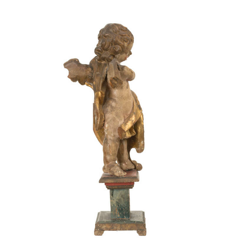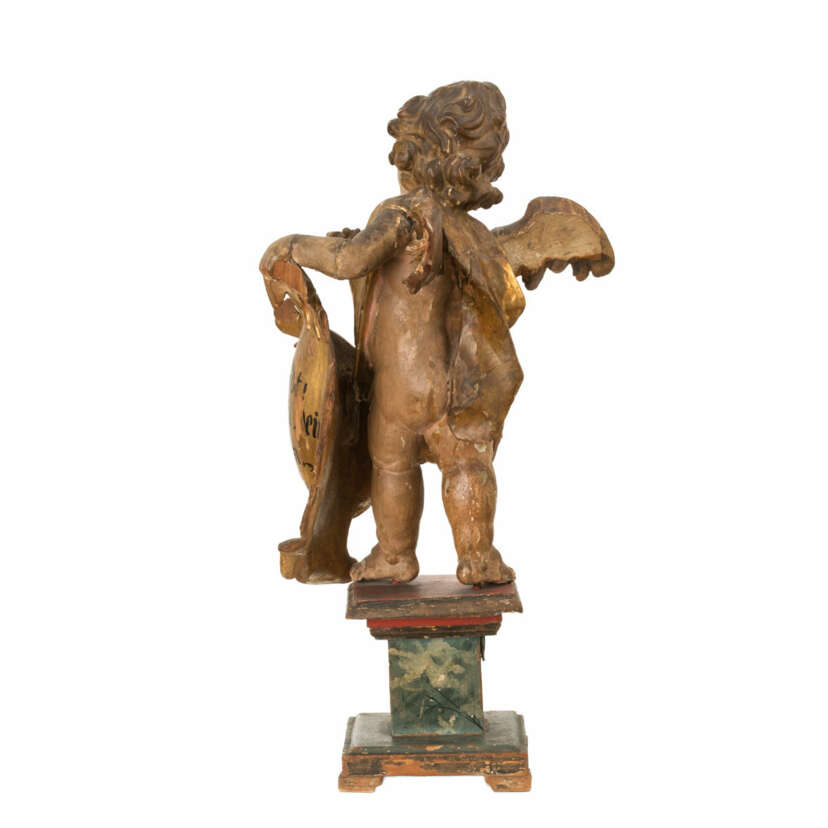 Putto on pedestal with cartouche, Franconian, 2nd half 18th century Wood, carved, height 61 cm, inscribed in the cartouche 'Oh Todt! ich will dein Todt sein!' (OT, Book of the Prophet Hosea 13, 14), original version present, in the incarnation partly extensively flaked off, the face partly, the pedestal and the consecration cross largely repainted, one wing and part of the cloth broken off