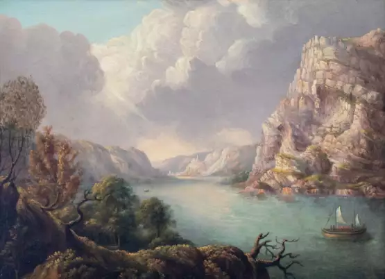View of the Lorelei on the Rhine, oil on panel, 23.5 × 30.5 cm visible dimensions, mounted