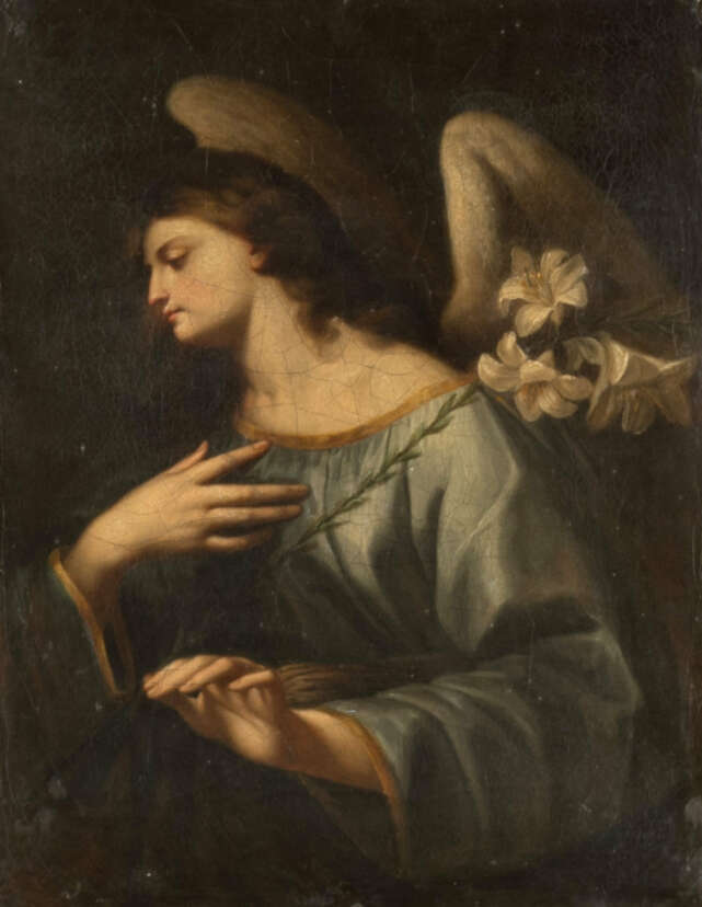 After Andrea Vaccaro: Archangel Gabriel Announcing the Conception of the Virgin, oil on canvas, 33 x 25 cm canvas dimensions, craquelured with cracks and small flaking, retouched, relined