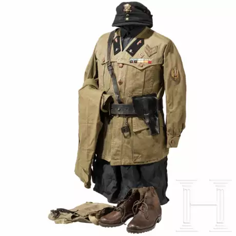 Schwarze Tuchfeldmütze mit aufgelegtem Totenkopf aus Metall. Schwarzes Lederschweißband. Im Deckel undeutliche Reste des Herstellerzeichens. Khakifarbener, kragenloser Uniformrock, wohl aus einer Sahariana des spanischen Bürgerkriegs umgearbeitet. Die schwarzen Spiegel mit hellrotem Fascio und metallenem Totenkopf. Über der linken Brusttasche Bandschnallen in zwei Reihen, gesticktes "Squadrista"-Abzeichen sowie Rangwinkel. Am linken Ärmel in Gold auf graugrünem Tuch gesticktes Abzeichen eines Ardito (Einzelkämpfer). Langes schwarzes Hemd mit gestickter "22" im Kragen. Wenig getragene, lange, khakifarbene Hose. Schwarzer Lederriemen mit Pistolentasche und Magazinlader für eine MAB 38 oder 44. Dazu eine khakifarbene Transporttasche für ein MAB 44, gestempelt "1943", mit Beriemung und Tragegurt sowie kleinem Bakelit-Ölgefäß.