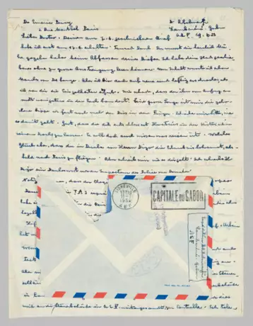 Uncertified, handwritten and signed letter and envelope, June 19, 1953, airmail paper, 4° format. Attached typewritten copy, probably by F. Bechtle. Minor signs of age, sheets subsequently fastened at the upper left corner with thread, page margins minor torn, envelope heavily damaged, stained.
