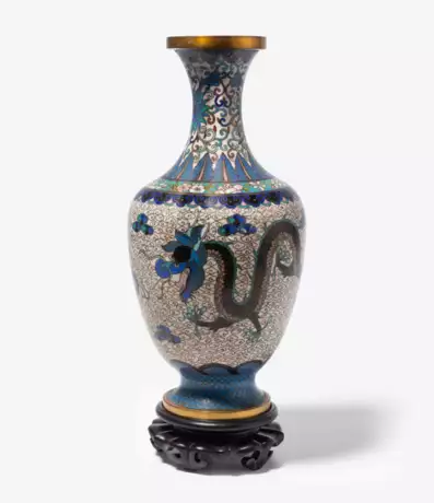 China, 20.Jh. Email cloisonné. Balusterform. Polychromer Drachendekor auf weissem Wolkengrund. Ruyi- und Blumenbordüren auf Schulter. H 23 cm. Mit Holzsockel.