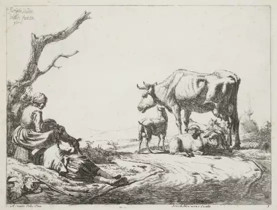 (1636 Amsterdam 1672). Der Hirt und die Hirtin mit ihrer Herde. Radierung 1653. 19,5 x 26,4 cm. Mit d. Namensz. u. Datum in d. Platte. Passep. mont. - Wurzbach 17.