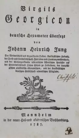 Schulte-Strathaus 16. Veitenheimer, Druckort Mannheim, 763. - Sehr seltene Veröffentlichung Jung-Stillings, dem Universalgelehrten aus dem Siegerland (Augenarzt, Staatsrechtler, Wirtschaftswissenschaftler, Technologie und mystisch-spiritualistischer Schriftsteller). - Seine vorliegende Übersetzung (lat.-dt. Parallel-Text) von Vergils großem Lehrgedicht, die vier Bücher der Georgica, hat er gleichsam als Agrar- und Forstwissenschaftler verfasst. Aufgrund mehrerer technischer und ökonomischer Aufsätze in der Fachliteratur erhielt Jung einen Ruf als Professor an die Kameral Hohe Schule in Lautern. Er gab daher seine Tätigkeit als Arzt auf und lehrte ab 1778 in Lautern als Professor der Landwirtschaft, Technologie, Fabriken- und Handelskunde sowie Vieharzneikunde. Als die Kameral Hohe Schule 1784 mit der Universität Heidelberg vereinigt wurde, zog er erneut um. Nach einigen Jahren in Heidelberg lehrte Jung von 1787 bis 1803 als Professor für ökonomische Wissenschaften an der Universität Marburg und wurde 1803 durch Karl Friedrich von Baden, später mit dem Rang eines Geheimen Hofrats in Geistlichen Dingen, zum Berater ohne ein öffentliches Amt berufen (Wikipedia). - Innen nur gering fleckig; Vorsätze mit zwei alten Namenszügen, Titelblatt mit zeitgen. Namenszug "Christfels" (wohl der ev.-luth. Theologe und Rektor des Predigerseminars in Oettingen Ph. Albrecht Christfels, 1732-1811).