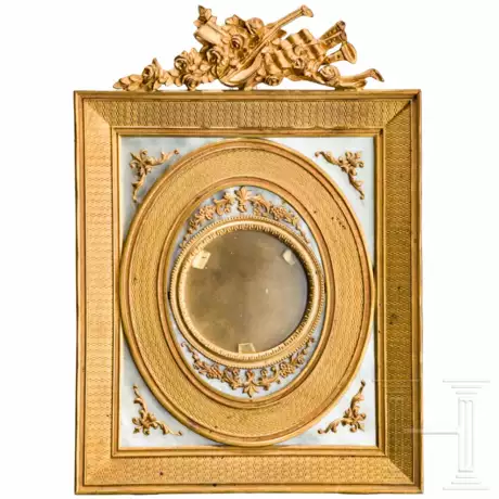 Rechteckiger Rahmen aus vergoldetem Messing mit fein guillochiertem Leisten. Zentral verglaste Aufnahme für eine kleine runde Miniatur (ca. 4,8 cm). Der Hintergrund mit Perlmutt belegt. Auf der Oberseite Aufsatz mit Musikalien-Dekor. Rückseitig vier Verschlussschrauben, davon eine ergänzt. Maße 18 x 13 cm.