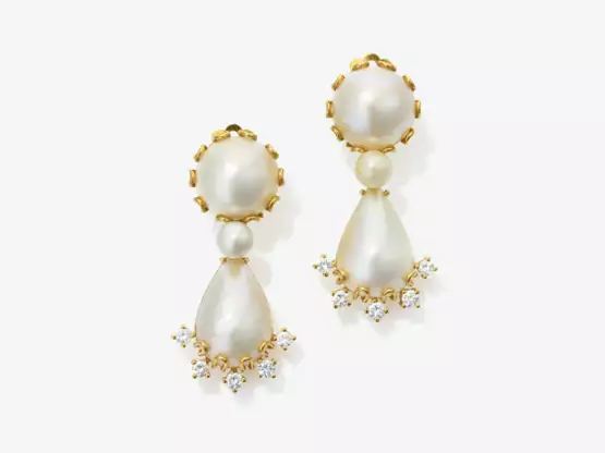 Yellow gold 585/-, hallmarked. 10 brilliant-cut diamonds totalling approx. 0.80 ct., fine white, G, VVS1, very good brilliance. 2 round Mabé cultured pearls, round diameter approx. 14 mm, 2 teardrop-shaped Mabé cultured pearls, approx. 20.45 x 13.21 mm, pink, very good lustre with iridescent pink. 2 round cultured pearls, diameters approx. 6.3 - 6.5 mm, light cream. In good to very good condition. Length approx. 4.5 cm, width approx. 1.6 x 4.4 cm. Ca. 21.37 g.