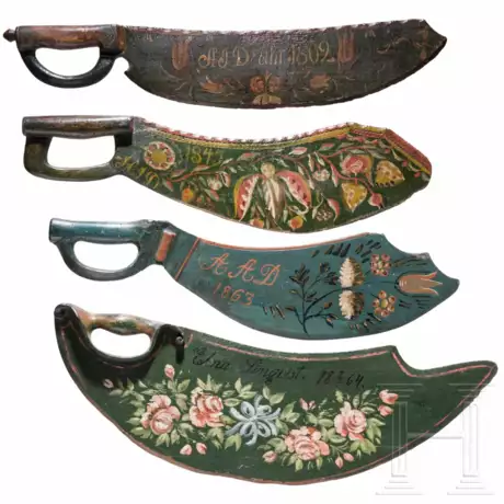 Vier schauseitig polychrom bemalte, unterschiedlich geformte Messer aus Holz. Jeweils datiert. Variierende Gebrauchsspuren, stellenweise leicht wurmstichig. Länge 53 - 58 cm.