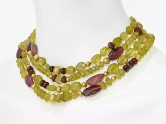 750/- yellow gold clasp, hallmarked. 4 strands with numerous tourmalines. The necklace is in very good condition, showing only minor signs of wear and tear consistent with age. Length approx. 47 cm. Ca. 155.4 g.