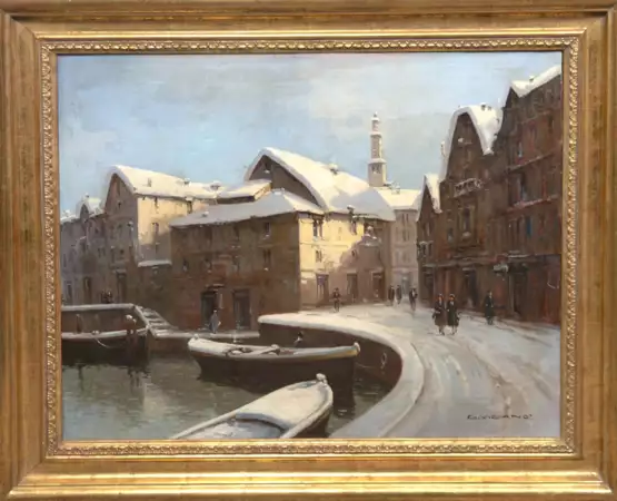 Лот 86 | Vigano, G. "Verschneite Stadtansicht mit Kirchturm und Personen", Öl/ Lw., sign. u.r., Lw. mit kl. Rissen, 50x59 cm, Rahmen