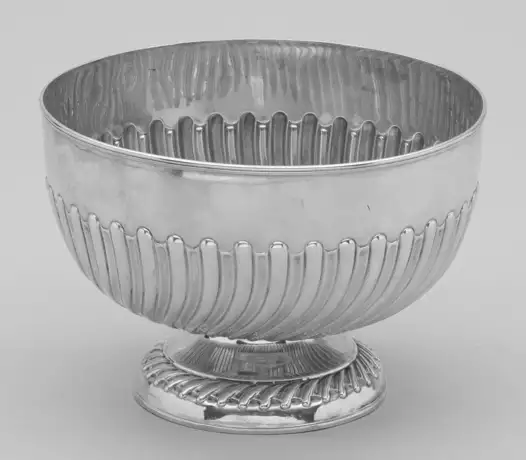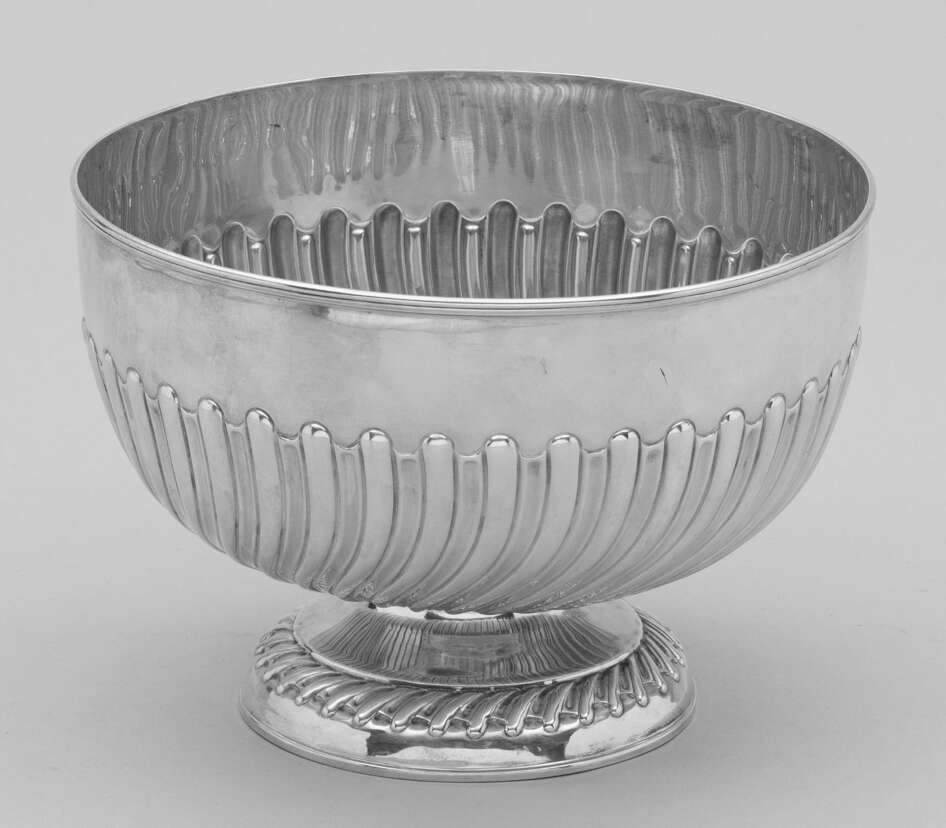 Sterlingsilber. Tief gemuldete Schale über aufgewölbtem Stand. Untere Wandungshälfte und Stand umzogen von geschweiften, zungenfriesähnlichen Godronen. Gest., Beschaumarken, Herstellerzeichen, Jahresbuchstabe "U". Gew. ca. 595 g. H. 15,3 cm. 22 cm.