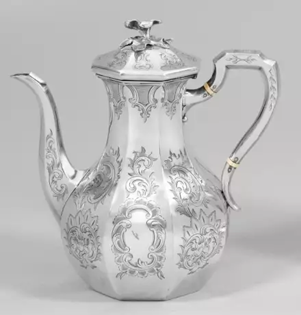 Sterlingsilber. Auf achteckigem Stand gekanteter, birnförmiger Korpus mit graviertem Rocaillen- und Akanthusblattdekor. Korrespondierender Röhrenausguss und Scharnierdeckel mit plastischem Blütenknauf. Rückseitiger Henkel mit Isolierscheiben aus Elfenbein. Minim. best.; Gest. Beschaumarken, Herstellerzeichen, Jahresbuchstabe "O". Gew. ca. 610 g. H. 23 cm.