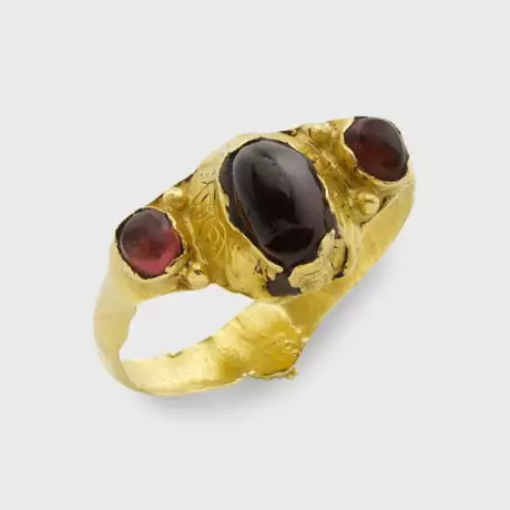 Gelbgold, 21,6 k. Schauseitig besetzt mit drei rot-folierten Glassteinen und gegenüberliegendem Türkis. Gew. ca. 3,70 g.