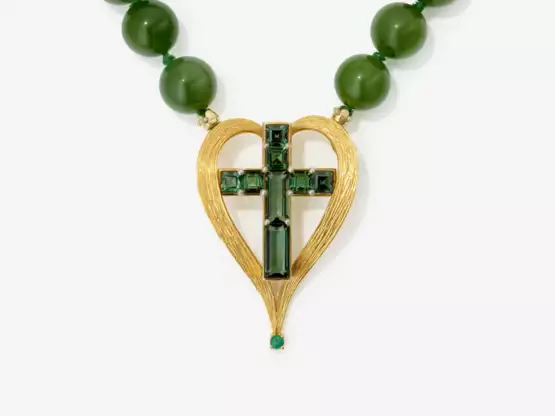 Goldschmiedeausführung: ein Besonderes Highlight ist dieses Collier aus 27 Nephritkugeln, zentriert ein einhängbares Mittelstück in Herzform, in dem ein Kreuz aus grünen Turmalinen funkelt. Ein kleiner Smaragd an der Herzspitze verleiht diesem einzigartigen Schmuckstück den letzten edlen Akzent, das Herz kann separat getragen werden. Perfekt für Liebhaber besonderer Vintage-Stücke.