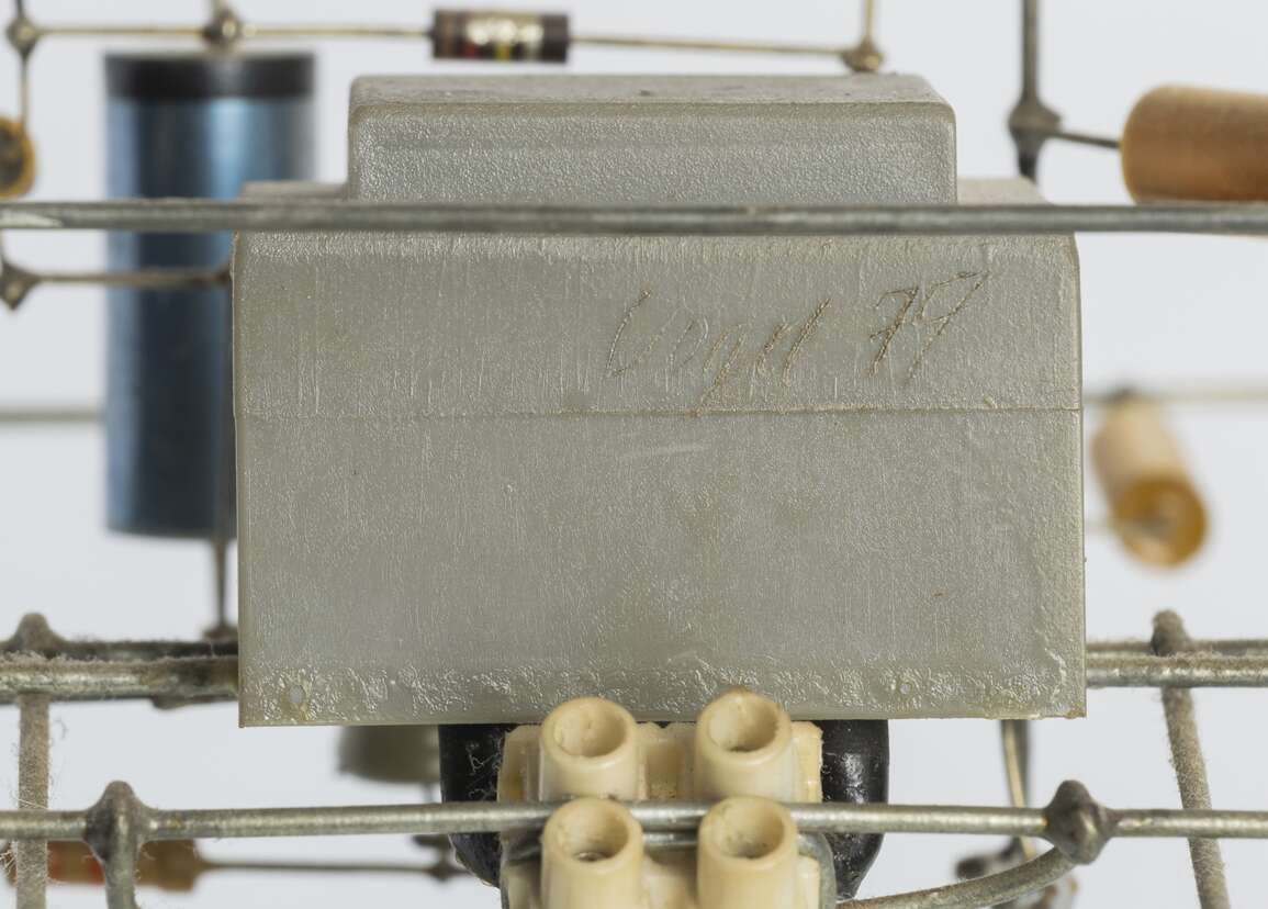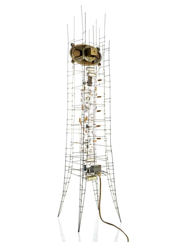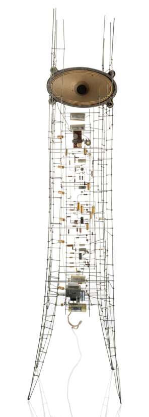 Störung, 1979. Drahtgestell mit Sensoren, Halbleitern, Drähten, Fotozelle und Lautsprecher. Rückseitig in Ritzung signiert und datiert.