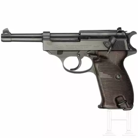 Kal. 9mmLuger, Nr. 20322, nummerngleich (Riegel ohne Nummer). Lauf leicht matt. Achtschüssig. Beschuss Adler/N. Standardbeschriftung. Ausfräsung im Verschluss hinter der Auszieherkralle noch länglich (alte Form). Originale Brünierung(?), partiell minimale Lagerspuren und feinfleckig. Bakelitgriffschalen. Magazin P 38, Abnahme "Adler 359". Seltenes Sammlerstück.