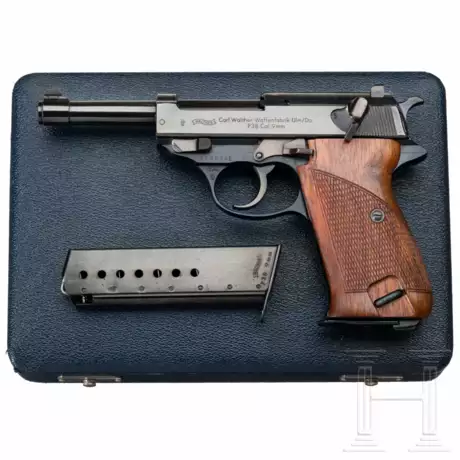 Cal. 9mmLuger, SN. 019870E, nummerngleich. Blanker Lauf. Achtschüssig. Beschuss 1963. Links am Verschluss Standardbeschriftung. Vollständige, originale Hochglanzbrünierung am Schlitten, schwarz eloxiertes Alugriffstück. Nussholzgriffschalen mit Fischhaut. Magazin. In dunkelblauer Walther-Schatulle, innen mit rotem Samt ausgelegt (Samt-Beschädigung im Mündungsbereich). Dazu Ersatzmagazin und Anleitung. Dazu der originale nrngl. Karton mit Ersatzmagazin, Putzstock, Anleitung und Schussbild.