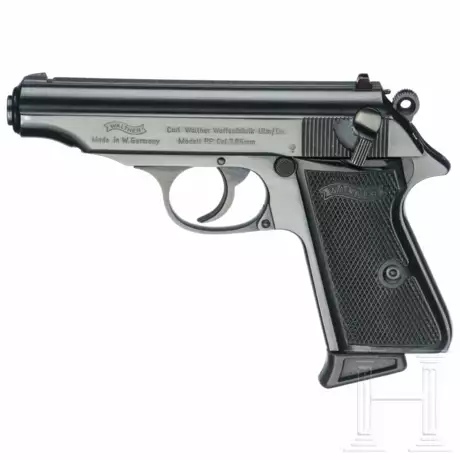 Kal. 7,65mmBrowning, Nr. 398953, nummerngleich. Blanker Lauf. Achtschüssig. Beschuss 1970. Kontrastvisier. Standardbeschriftung. Vollständige, originale Hochglanzbrünierung. Schwarze Kunststoffgriffschalen. Magazin mit Schuh. Neue Erhaltung. Dazu dunkelbraune Ledertasche aus dünnem Leder. Innen grüner Tintenstempel ,,890 / PP". Nähte in Ordnung, fast neuwertig.