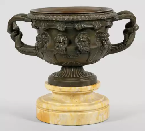 Bronze, dunkel patiniert sowie gelb gemaserter Marmor. Über gestuft ansteigendem Profilsockel balusterförmiger, teilw. kannelierter Korpus nach dem Vorbild der berühmten 1771 wieder entdeckten Warwick-Vase aus dem 2. Jahrhundert, seitlich mit verschlungenen Henkeln sowie umlaufend der Wandung reliefplastisch gestalteten Maskarons. Schmaler Lippenrand mit Zungenfries. H. 35 cm.
