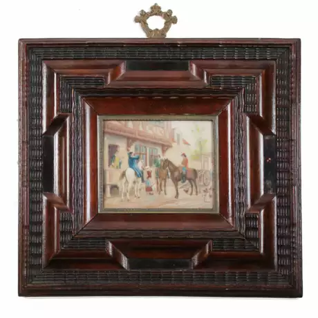(Miniaturmaler, 20. Jh.) Dorfszene mit Reitern. Gouache auf Bakelit. 8 x 10 cm. Unt. re. sign. Ger. (A2)