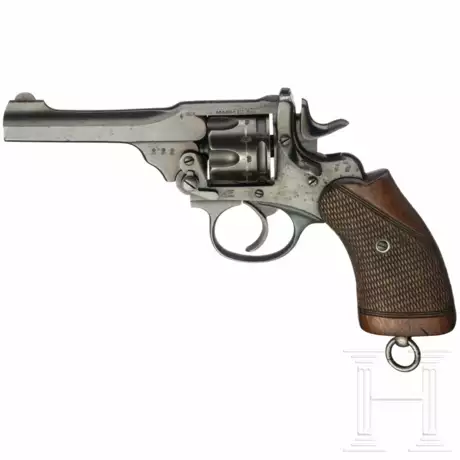 Cal. .38S&W, SN. 55252, nummerngleich. Blanker Kipplauf, Länge 4". Sechsschüssig. SA/DA. Brit. Beschuss und broad arrow Abnahme. Auf der Rahmenbrücke "Webley & Scott Ltd. / Birmingham", links "Mark III .38", am Rahmen winged bomb. Leicht überarbeitet und neu brüniert, etwas fleckig. Übergroße Sondergriffschalen aus Nussholz mit Fischhaut, bei W & S als "butt no. 4" bezeichnet, mit Dellen und Druckstellen. Fangring. Timing in Ordnung.