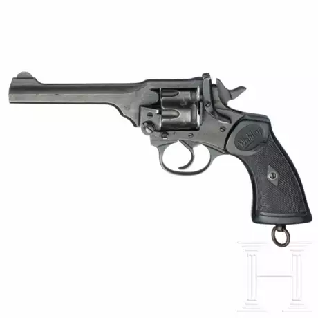 Kal. .380RevMK.I, Nr. 157078, nummerngleich. Blanker Lauf, Länge 10 cm. Sechsschüssig. Brit. Beschuss und Abnahmen broad Arrow und "U" im Stern. Standardbeschriftung des Models, das etwas raue originale "WAR FINISH" etwas fleckig. Schwarze Kunststoffgriffschalen mit geringen Gebrauchsspuren. Fangring.