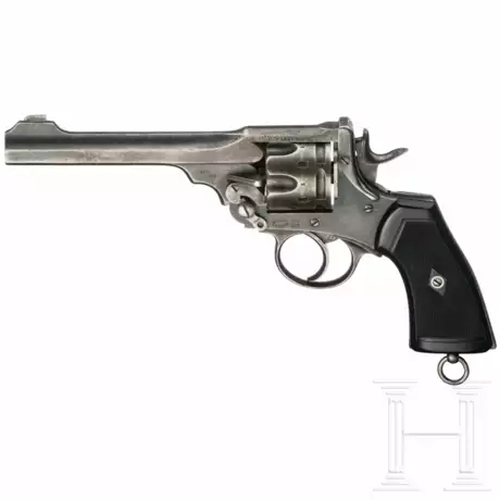 Kal. .455Webley, Nr. 122686, nummerngleich. Leicht matter Lauf, Länge 150 mm. Sechsschüssig. Brit. Beschuss. Links an der Rahmenbrücke bezeichnet "'W.S' Army Model", auf der Laufschiene einzeilige Firmierung. Kleine Abnahmen broad arrow. Links am Rahmen "Webley / Patents" und Logo. Trommel etwas wackelig. Am Griffrücken bezeichnet "B.S.A.C. / 133". Originale Brünierung, Tragespuren. Schwarze Kunststoffgriffschalen. Fangring. In Webtasche, innen am Deckel mit schlecht leserlicher Beschriftung, jedoch leserlich "1943".