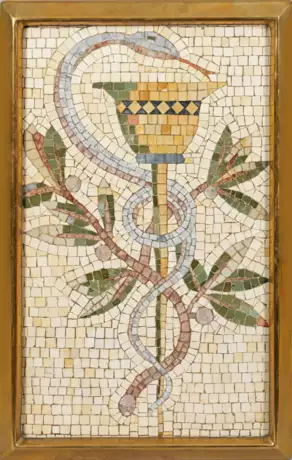 Travertin sowie in unterschiedlichen Grün-, Grau- und Violetttönen gemaserter Marmor. Auf cremefarbenem Fond flächendeckende Darstellung eines großen Äskulapstabes, umgeben von üppigem Lorbeerblatt. Umlaufend profilierte Messingrahmung sowie rückseitig aufgeklebte Zeitungen. 60 cm x 39 cm.