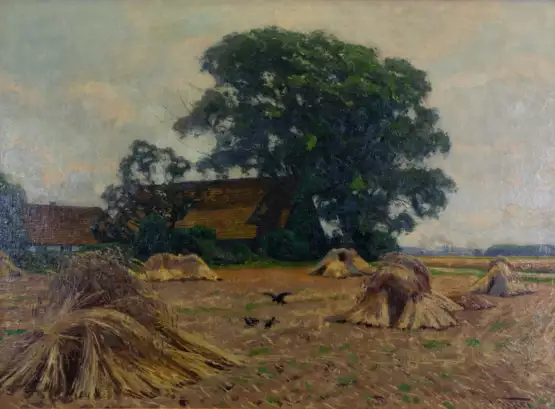 Grain fields on the Lower Rhine with smoking chimneys in the distance, oil on canvas, 60 x 80 cm canvas dimensions, signed, craquelure, lined, minimally retouched
