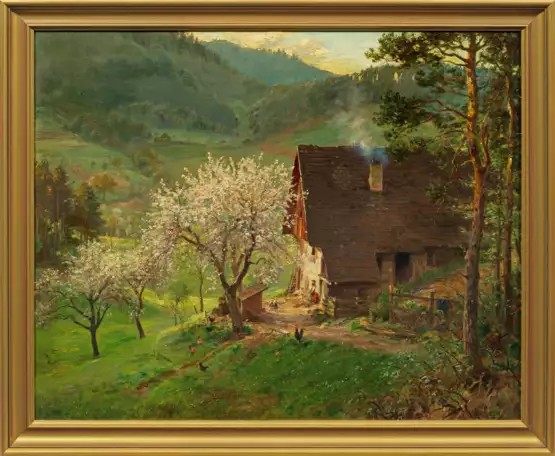 Vor einem Schwarzwälder Haus blühen die Kirschbäume und Kinder spielen in der Frühlingssonne. Idyllisches Landschaftsbild Hasemanns, der an der Kunstakademie in Berlin, an der Großherzoglich-Sächsischen Kunstschule in Weimar und an der Großherzoglich Badischen Kunstschule Karlsruhe bei Gustav Schönleber studierte. Hasemann schloss sich der Weimarer Malerschule an, 1880 kam er zum ersten Mal nach Gutach und war im ausgehenden 19. Jh. mit seinem Schwager Curt Liebich Gründer der Gutacher Malerkolonie. Sein Oeuvre umfasst vor allem Szenen aus dem ländlichen Leben, mit der Entdeckung der Gutacher Tracht und der Schwarzwaldgehöfte als künstlerisches Sujet, prägten Hasemann und Malerkollegen das volkstümliche Bild des Schwarzwalds. Öl/Lwd. R. u. sign.; 60 cm x 73 cm. Rahmen.